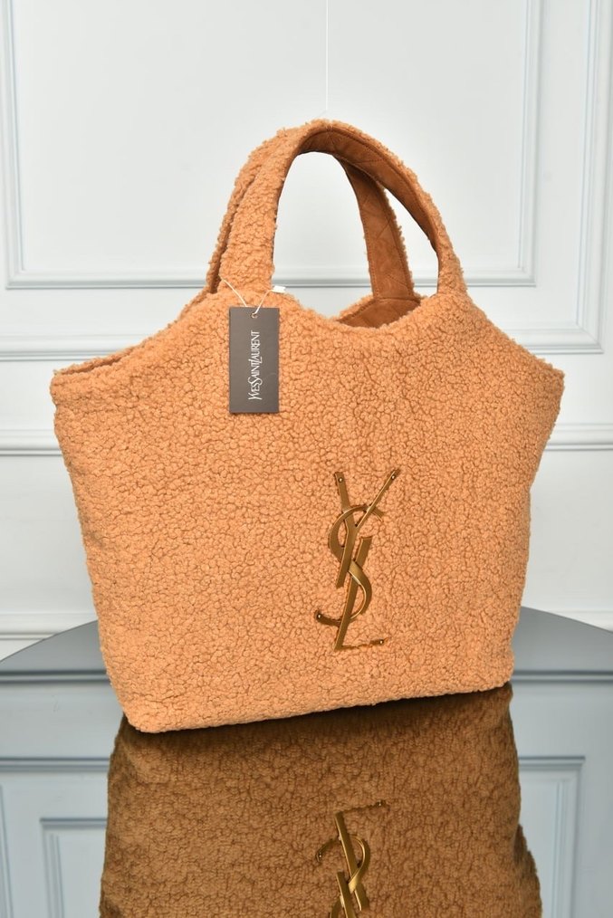Bu kadın çantası, yumuşak bej süet ve kürk detaylı dış yüzeye sahiptir. Önünde parlak, baskılı YSL logosu bulunur ve günlük kullanıma uygun, çağdaş, rahat bir stildir. YVES SAINT LAURENT - Icare in Shearling İthal Aksesuar Ölçüler : 58 × 43 × 8 cm