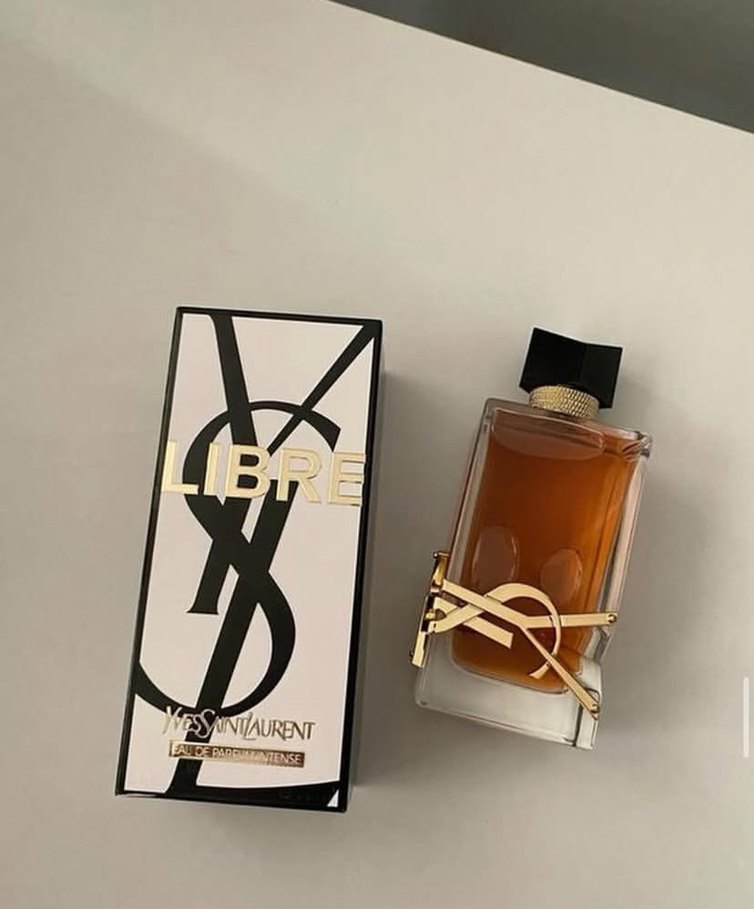 Yves Saint Laurent Libre kadın parfümü, altın detaylı dikdörtgen şişede zengin amber kokusuna sahiptir. Şık ambalajda YSL logosu öne çıkar.
