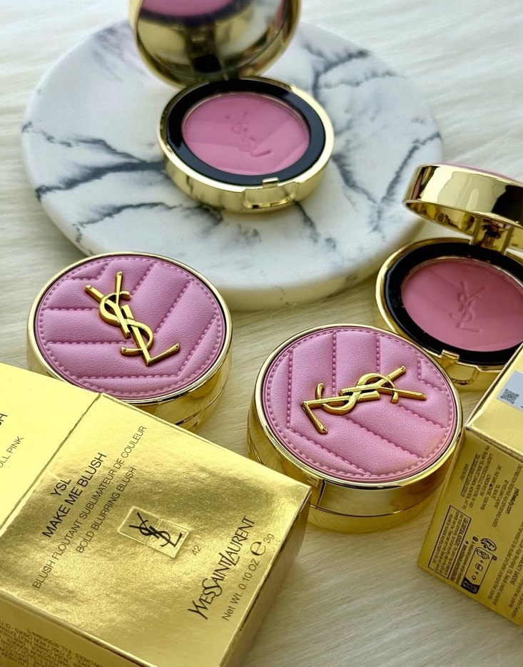 Yves Saint Laurent markasına ait parlak pembe renkte allık. Altın ve pembe kaplamalı, YSL logosu bulunan şık kutusunda ve aynalı.
