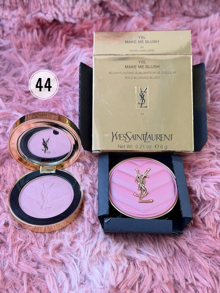 Yves Saint Laurent Make Me Blush 44 numara, parlak pembe renkte 6g ağırlığında allık. Kapağında YSL logosu bulunur.