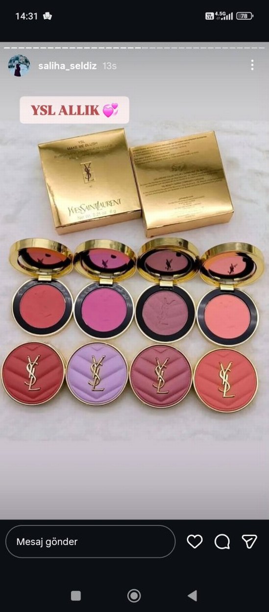 Yves Saint Laurent parlak pembe tonlarda, canlı renk ve pürüzsüz bitiş sunan allıklar. Kompakt kutuda YSL logosu yer alıyor.