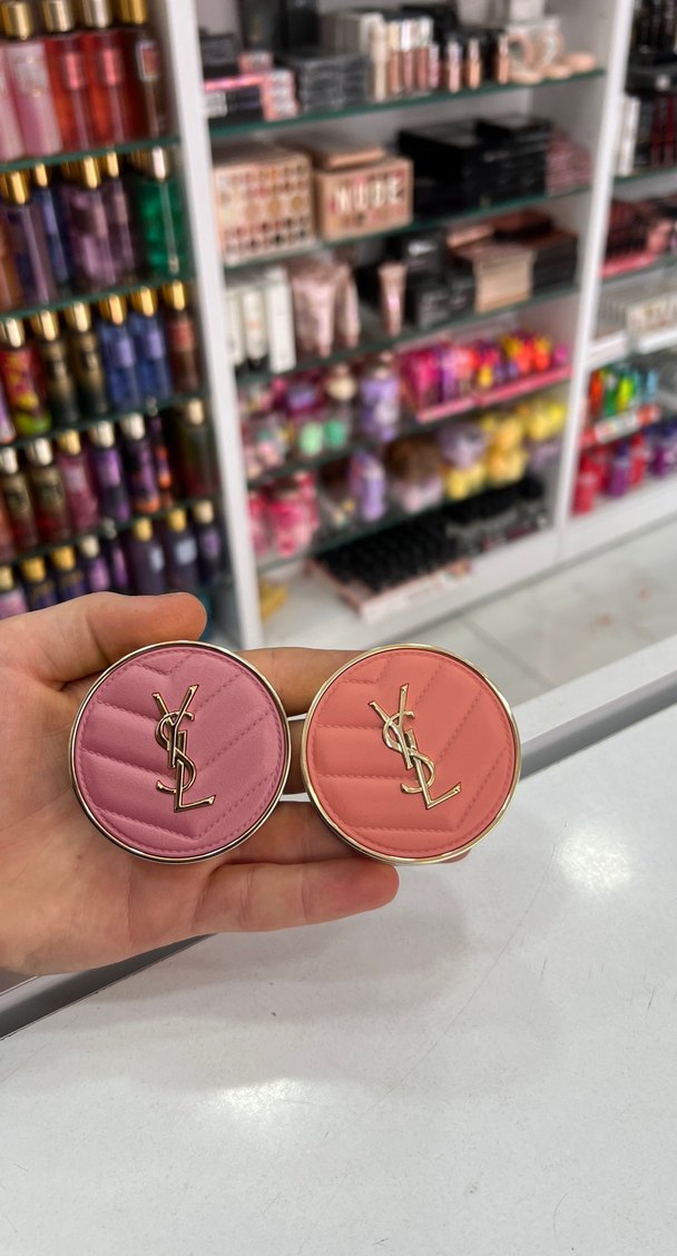 Yves Saint Laurent marka, kapakta altın YSL logosu ve kapitone deseni bulunan parlak pembe allık. Yanaklara ışıltılı bir dokunuş katar.