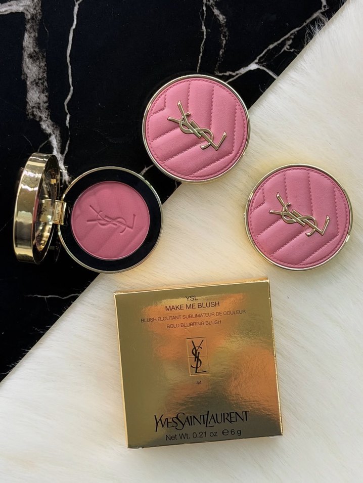 Yves Saint Laurent imzalı parlak pembe allık, yumuşak ve kolay karışan dokusuyla şık kutuda sunulur.