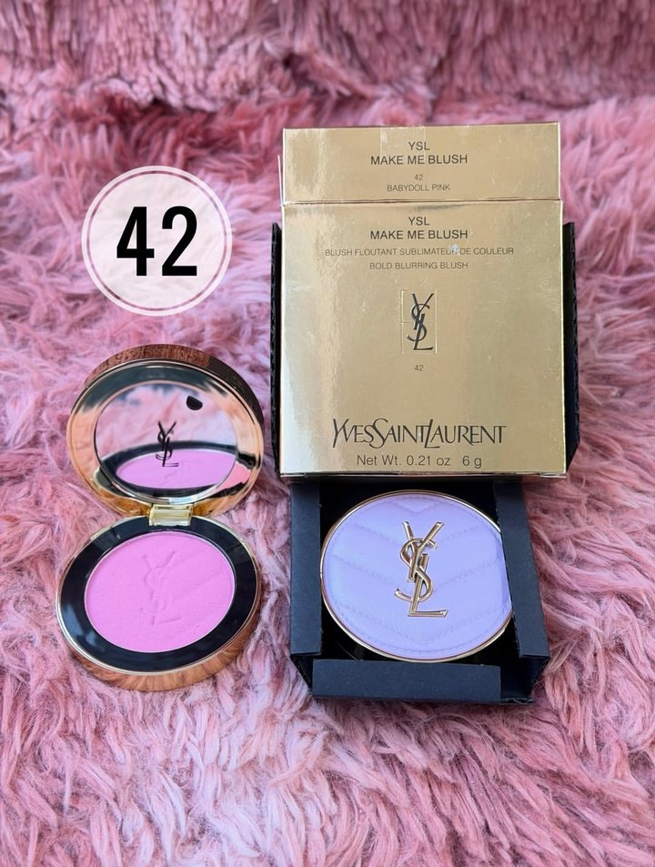 Yves Saint Laurent'in 42 numara Babydoll Pink allığı, parlak pembe renkte ve 0.21 oz ağırlığında. Altın renkli ambalajda YSL logosu bulunur.