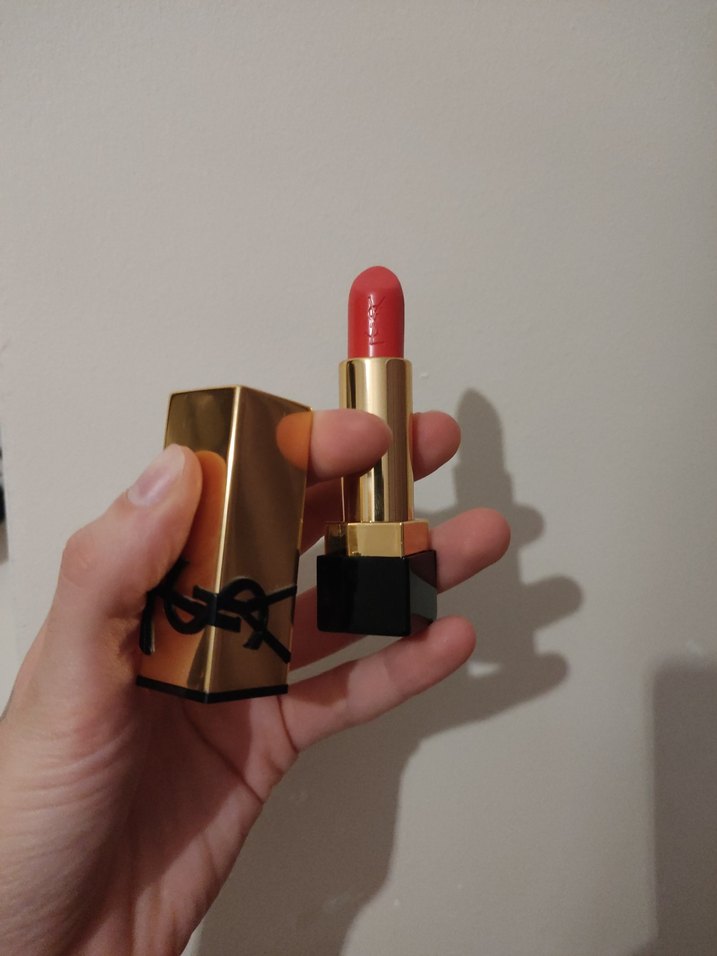 Parlak kırmızı renkte, altın ve siyah kapaklı lüks görünümlü ruj. mercan, narçiçeği rengidir. bir iki kere sürdüm. açık bir renk canlı. saten görünümlü parlaktır. sephoradan aldım. #ruj #ysl