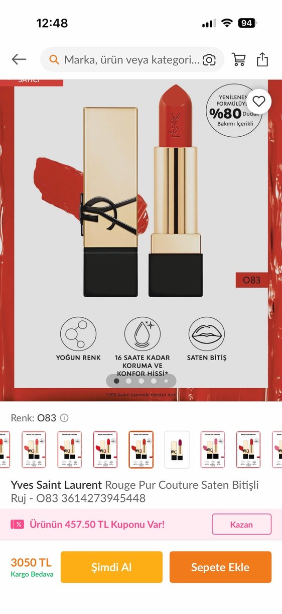 Yves Saint Laurent 083 numara ruj, yoğun renk ve saten bitiş sunar. %80 bakım içeriğiyle 16 saate kadar konfor ve koruma sağlar. 1 kere kullandım rengi uymadığı için satıyorum.