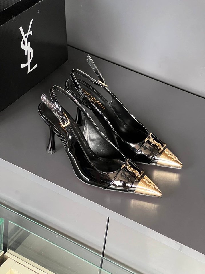 YVES SAINT LAURENT✨ New Season Imported heel With Dusty Bag With Original Box YSL Siyah deri stiletto, parlak altın uç ve tokalı bant detaylarıyla modern klasik tarzı yansıtır. Ofis kullanımı için uygundur.