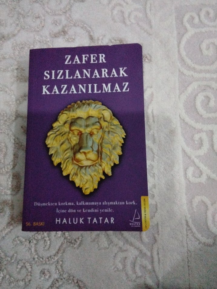 Haluk Tatar'ın 'Zafer Sızlanarak Kazanılmaz' adlı romanı, korkuyu yenip azimle başarıyı anlatıyor. Kapakta aslan resmi bulunuyor.