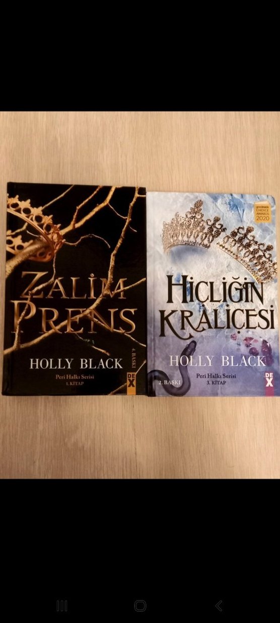 Holly Black'in Peri Halla Serisi'nden iki roman; Zalima Prens ve Hicliğin Kraliçesi, fantastik temalı kapaklarla.