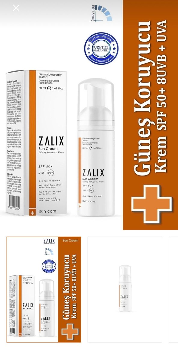 Zalix Güneş Koruyucu Krem SPF 50+ UVA/UVB filtresi ile cildinizi güneşin zararlı etkilerinden korur. Dermatolojik olarak test edilmiştir.