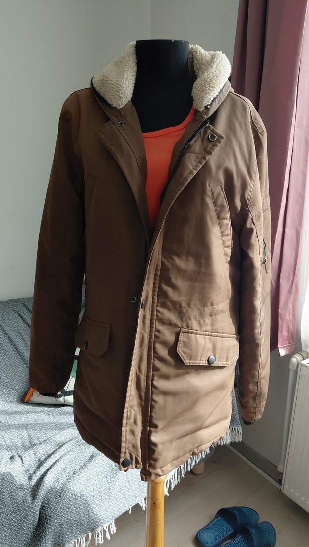 Uzun kollu, düğmeli kahverengi midi ceket, yumuşak ve sıcak iç astar ile sade tasarıma sahip. Günlük rahat sokak stiline uygundur.