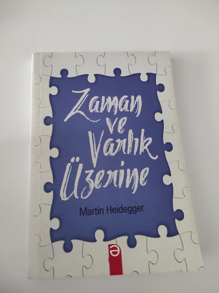 Martin Heidegger'in "Zaman ve Varlık Üzerine" kitabının kapağını gösteren, kenarları puzzle parçası şeklinde beyaz bir puzzle.