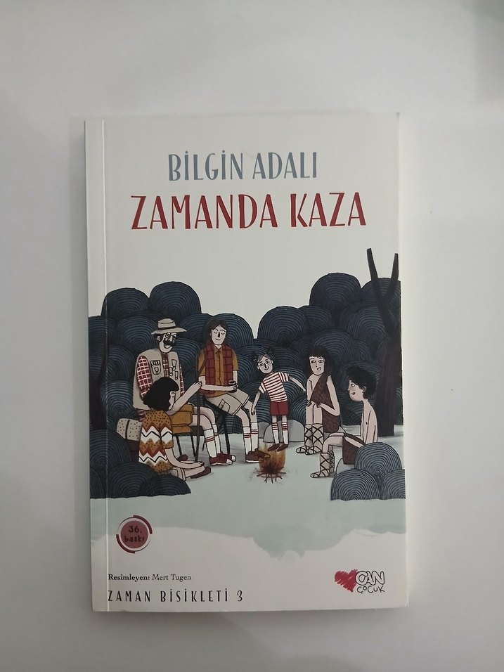 Bilgin Adalı'nın Zamanda Kaza adlı hikaye kitabı, Zaman Bisikleti serisinden, kamp ateşi etrafında toplanmış karakterlerin çizimleriyle.