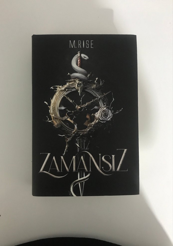 M.Rise'in "Zamansız" adlı romanı, kırık bir saat ve beyaz gül detaylı karanlık kapak tasarımıyla dikkat çekiyor. Zamansız temalar işleniyor.