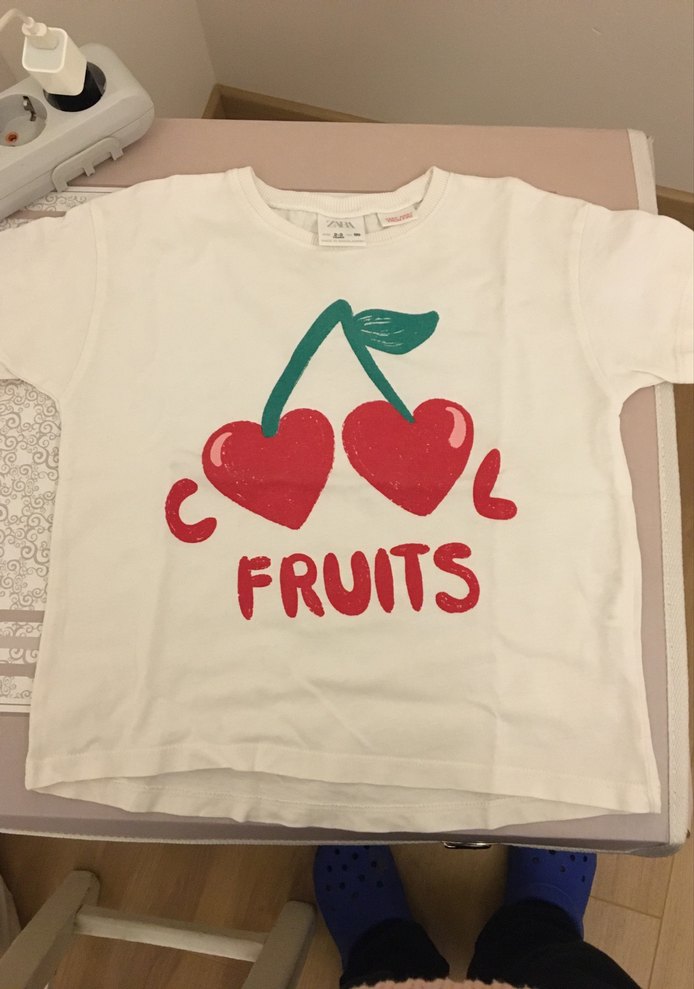Pamuklu, beyaz, kısa kollu tişört Kiraz baskısı var Yıkanmış, ütülenmiştir Lekesi, defosu yoktur.