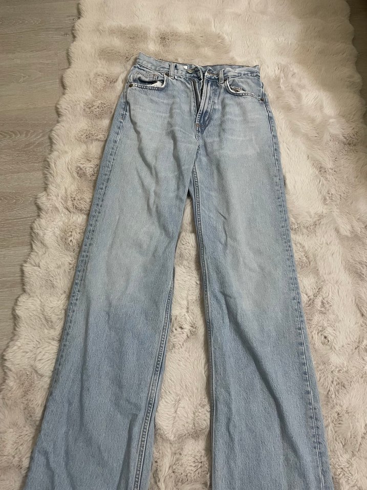 Kadınlar için geniş kesim, normal boy kot pantolon. Açık mavi renk ve sade tasarım gündelik kullanıma uygundur.
