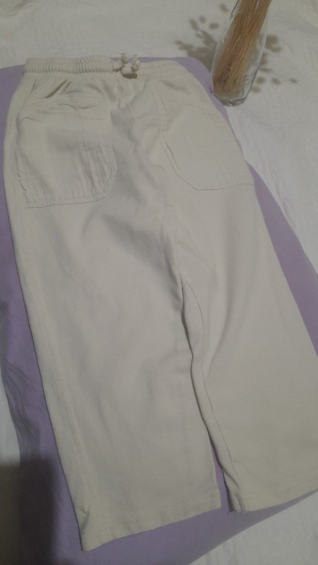 Gevşek kesim, midi boy, iki arka cepli beyaz keten pantolon, rahat ve şık bir dış mekan görünümü sunar.