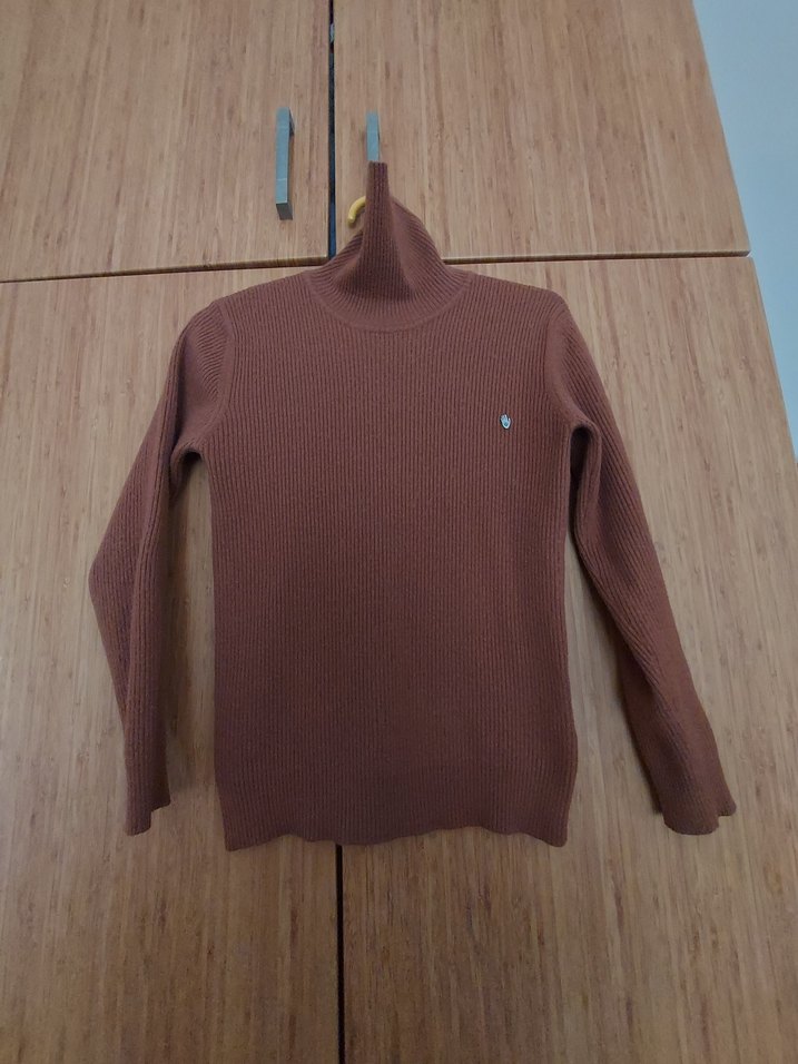 Kahverengi boğazlı, uzun kollu ve örgü dokulu yün kadın kazak. Normal boyda, sade ve fit kesim, günlük rahat sokak stili için uygundur. tertemiz aynı mağazadaki gibi sorunsuz yumuşacık çok hoş bi kazak marka temsili