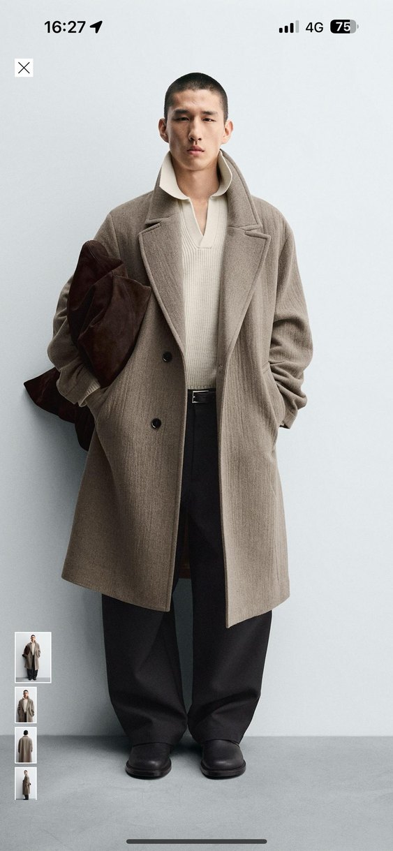 Kahverengi çift düğmeli kaban, klasik yaka ve rahat kesime sahiptir, günlük veya resmi kıyafetlerin üzerine giyilebilir.