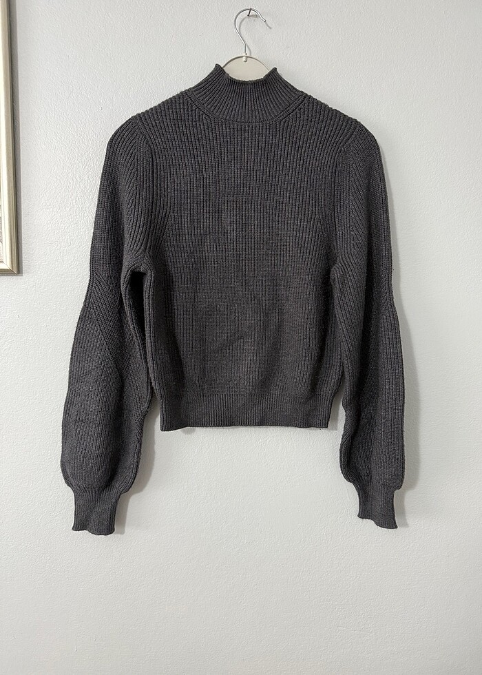 Zara marka, S beden, antrasit renkte fitilli kazak. Dik yaka ve hafif balon kol modeldir.