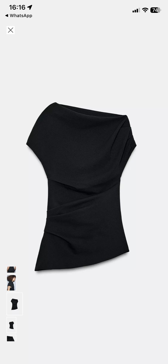 Drapeli, siyah kolsuz mini bluz, tekdüze yapısıyla tekne yakalı ve vücuda oturan kesime sahiptir. Minimalist ve çağdaş tarzda, sentetik kumaştan üretilmiştir.