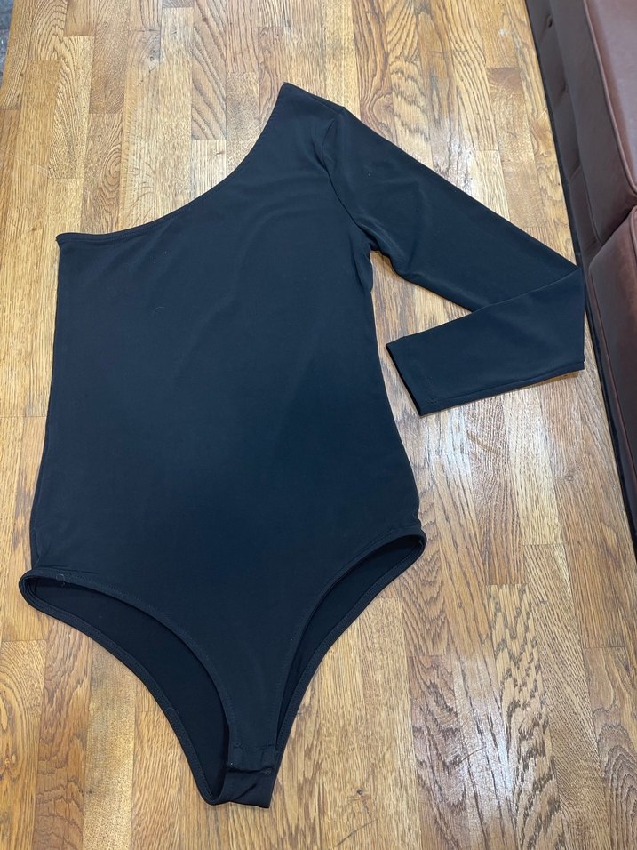 Tek omuzlu, uzun kollu, siyah kadın body. Sentetik kumaştan, atletik ve şık bir görünüm sunar. Günlük kullanıma uygundur. Ürün neredeyse hiç kullanılmamıştır sıfır ayarındadır omuzdan boy 72 cm iki kol arası 35 cm ebatlarındadır