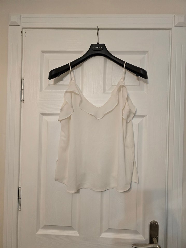 Yeniden farksız. Fırfırlı V Yaka. ister tek ister takım elbise içine giyilebilir, tiril tiril askılı bluz. Arkası daha derin dekolteye sahip, şahane bir bluz. 40-42 bedene uygun.