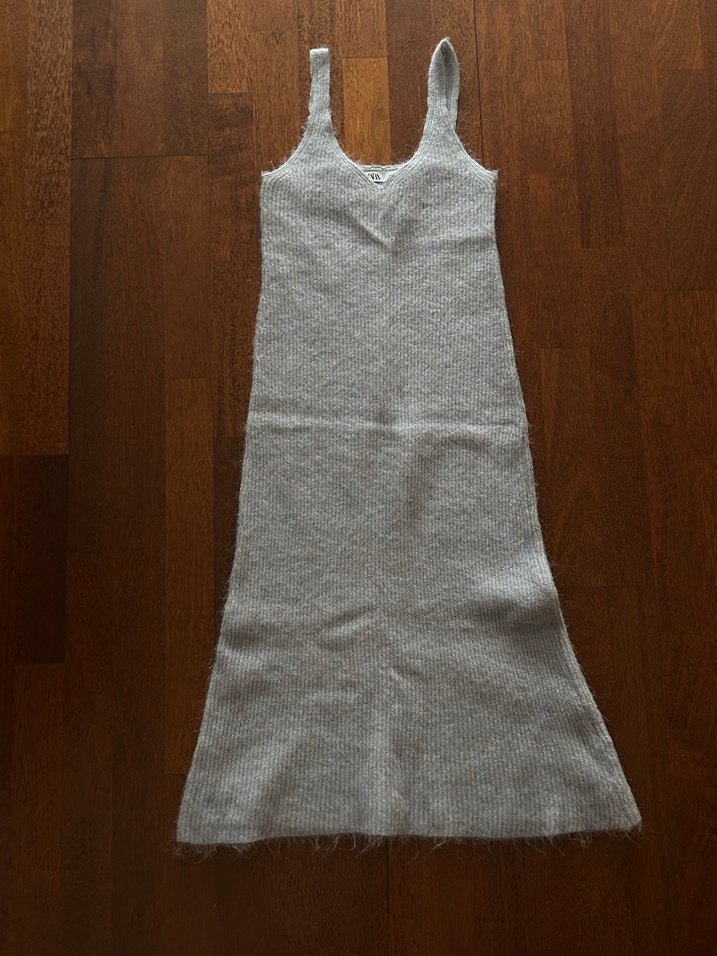 Zara alpaka & yün askılı elbise. Bir defa giyildi, kusursuz . Beden - M , uzunluk - 114 cm , eni- 36 cm . Rengi gri-mavi arasında, fotoğrafta daha gri gözüküyor.