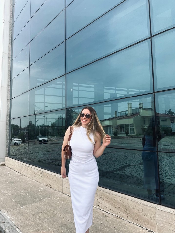 Yüksek yakalı, kolsuz ve vücuda oturan beyaz elbise, sokak modasına uygun rahat ve şık bir görünüm sunar. Astarlıdır.