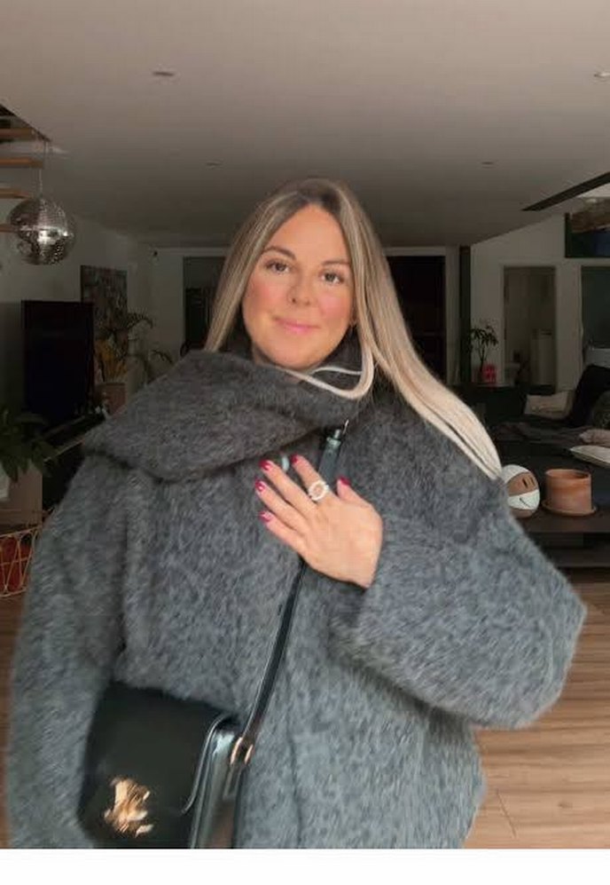 Gri renkli yün kadın kaban, bol kesim ve uzun kolludur. Yüksek yakalı, kürklü detaylara sahip, normal midi boyda günlük kullanım için uygundur.