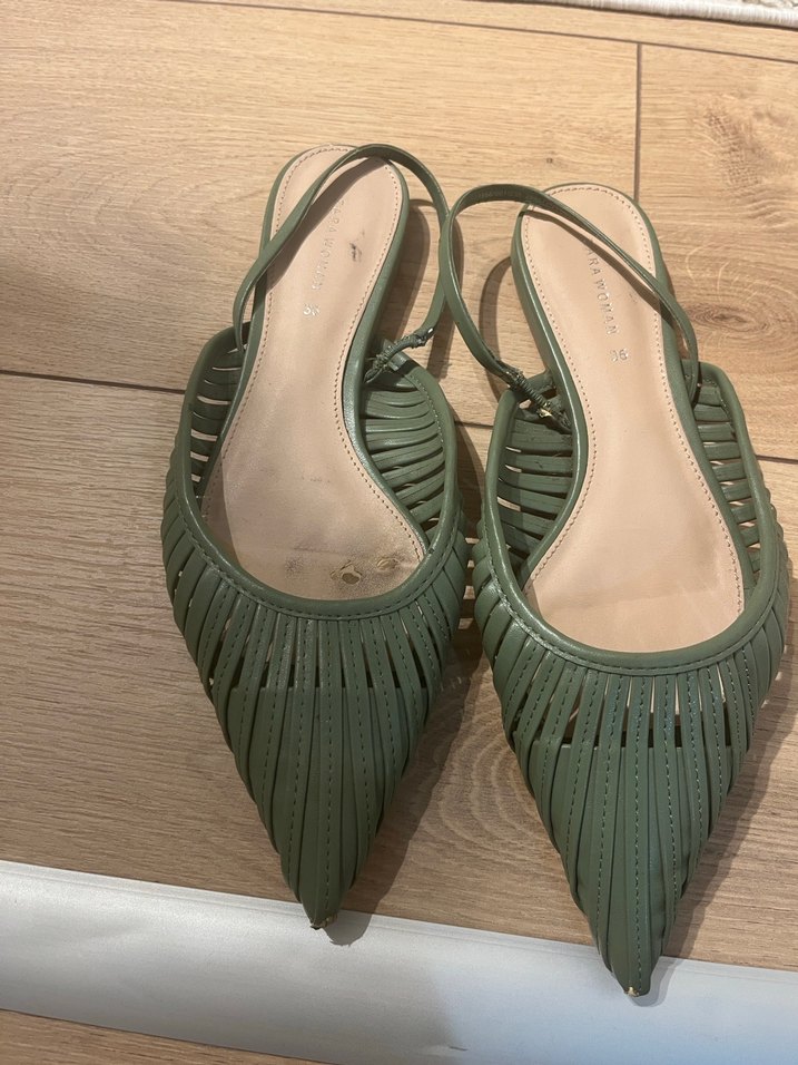 Yeşil renkte, pilili tasarıma sahip, stiletto topuklu ve arkası açık bantlı kadın babettir. Esnek kauçuk malzemeden yapılmıştır ve pastel tonlarıyla çağdaş bir görünüm sunar.