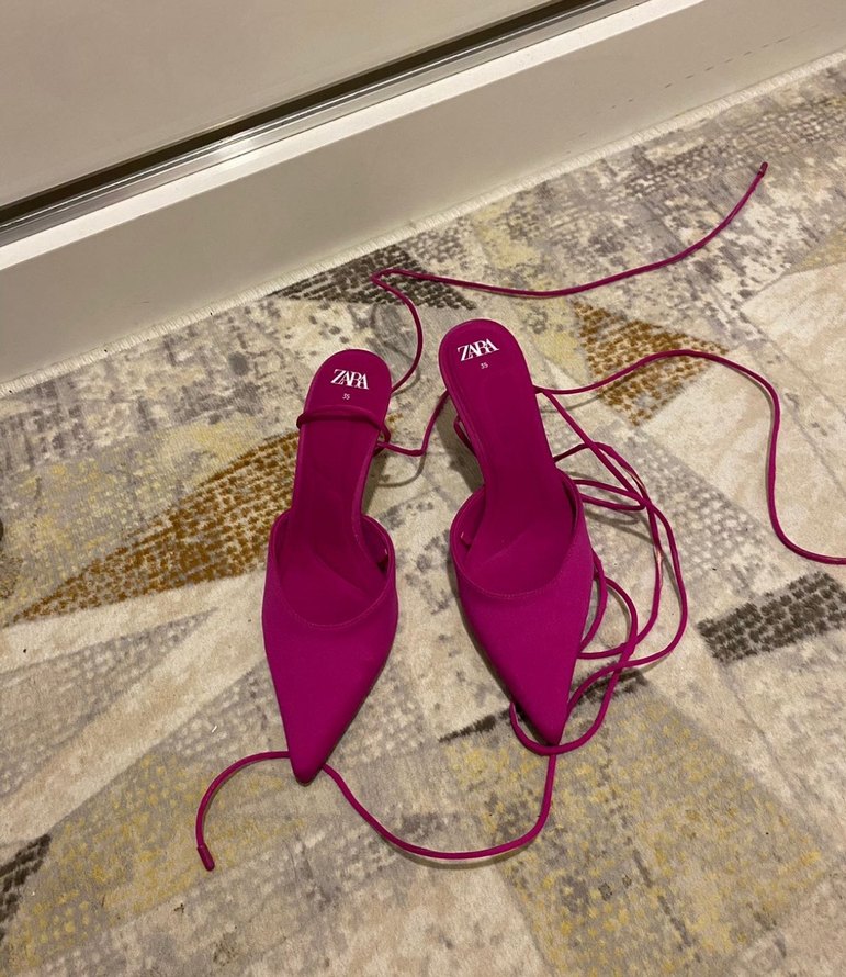 Zara marka, bağcık detaylı, saten dokulu koyu pembe stiletto. Romantik akşamlar için uygundur.