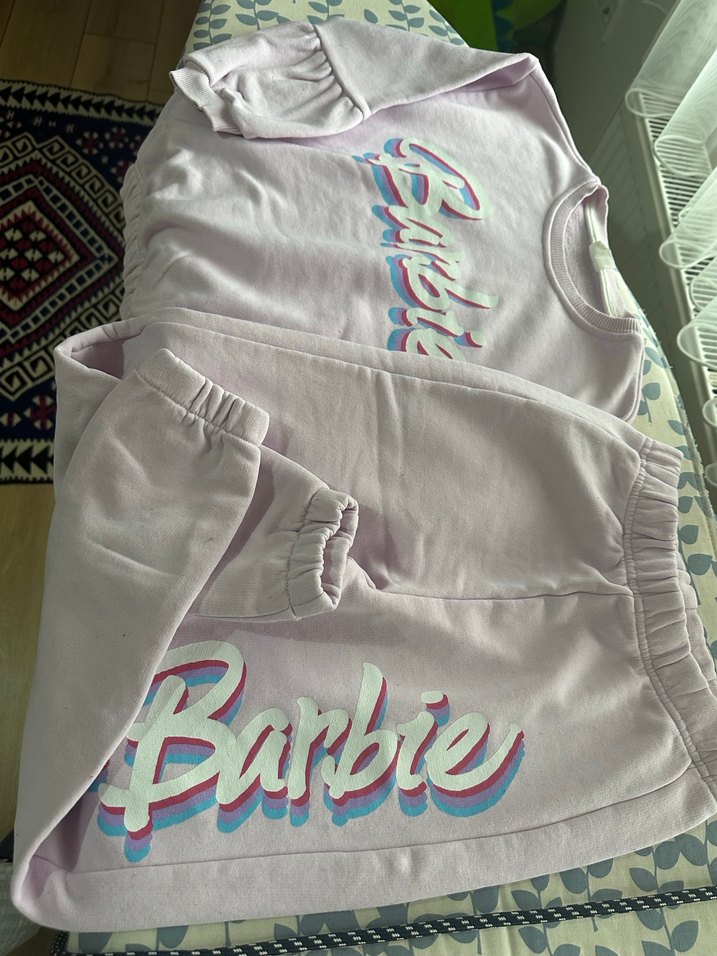 Bir kusuru yoktur. 9-10 yaş zara barbie eşofman takım Pastel mor renkli, baskılı 'Barbie' logolu, bol kesim kız eşofman takımı. Üstü uzun kollu ve bisiklet yaka, yumuşak sentetik kumaştan üretilmiştir.