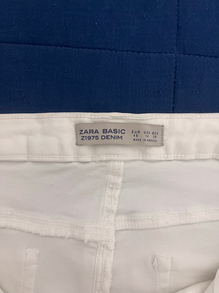 Zara Basic beyaz denim pantolon, normal kesim ve fermuarlı. Gri tonlu baskılı, günlük rahat kullanıma uygun midi boyda.