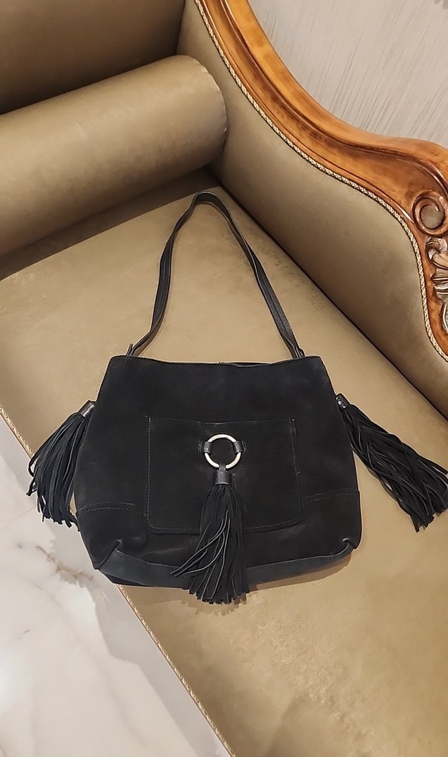 Siyah süet çanta, püskül detayları ve minimalist goth tarzıyla günlük kullanım için uygundur.