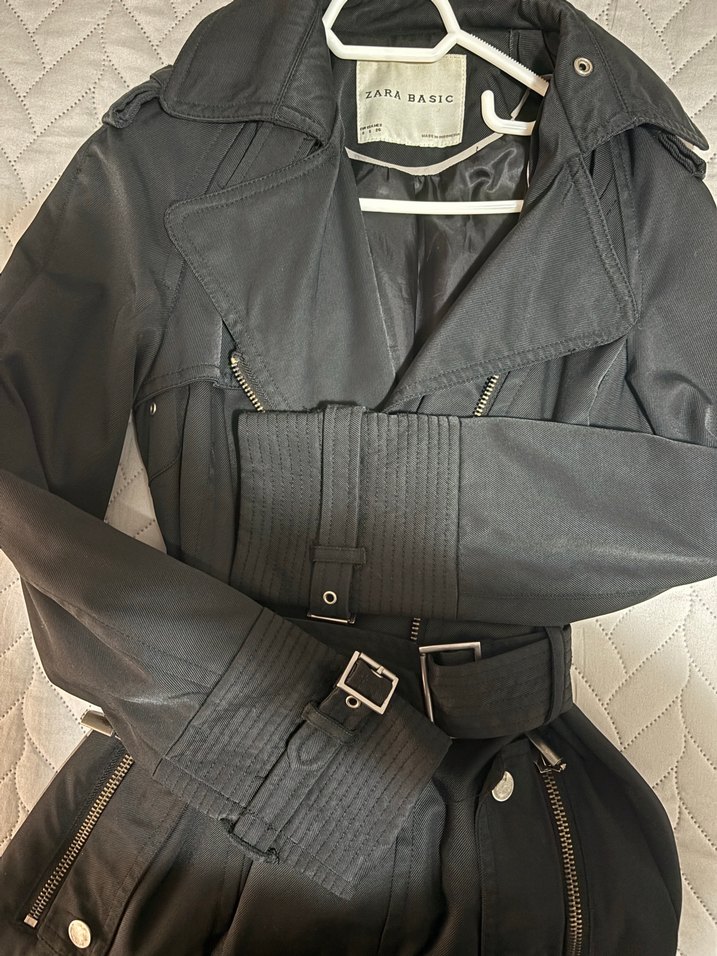 Zara Basic'in siyah trençkotu, kemerli ve dar kesimlidir. Notlu yaka ve askılı kol detaylarıyla midi boyda, günlük sokak modasına uygun şık bir parçadır. Xs-s uyumludur.