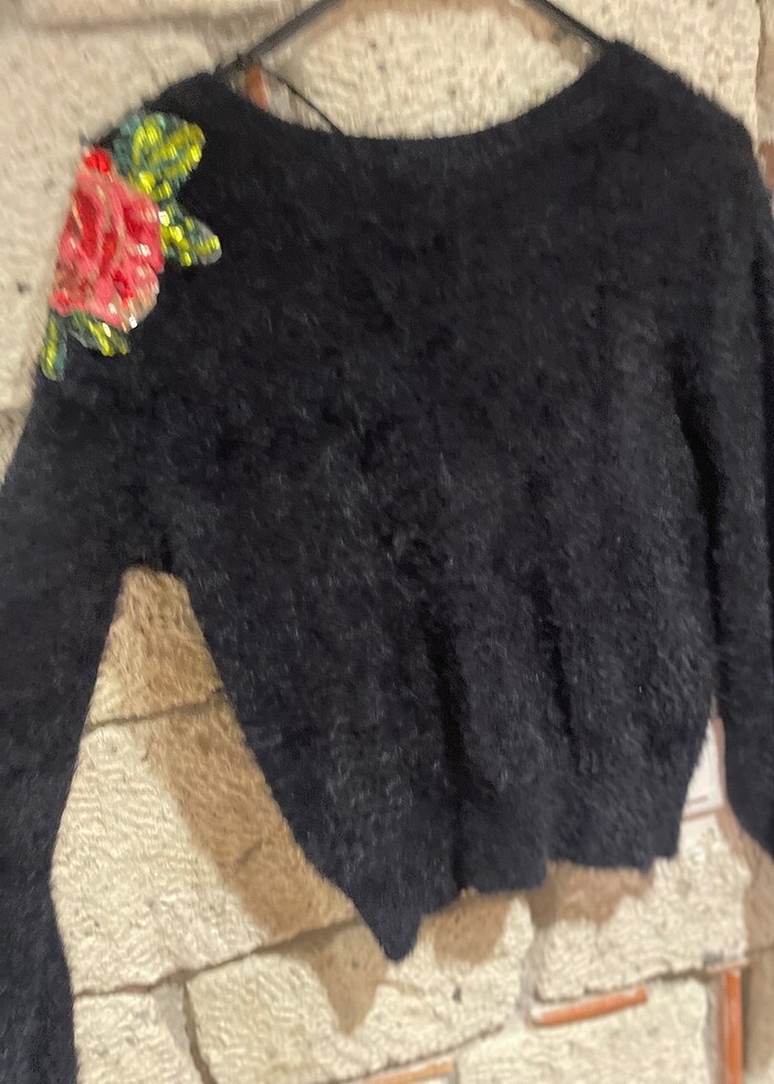 Ve yakalı omuzunda pullu payetli gül motifi var lacivert kullanılmadı kadife gibi yumuşak sorunsuz önden ve yaka