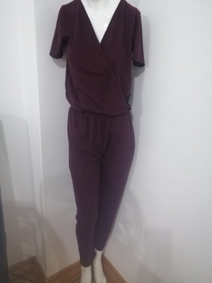 Bordo renkli, V yakalı ve kısa kollu kadın tulumu, sentetik kumaştan üretilmiş, rahat ve modern bir tasarıma sahip. Midi boy ve desensiz yapısıyla günlük kullanıma uygundur. Ürün temiz ve sorunsuzdur herhangi bir sorunu yoktur bir iki kez kullanılmıştır iki koltuk arası 45 boy 1metre 42 cm
