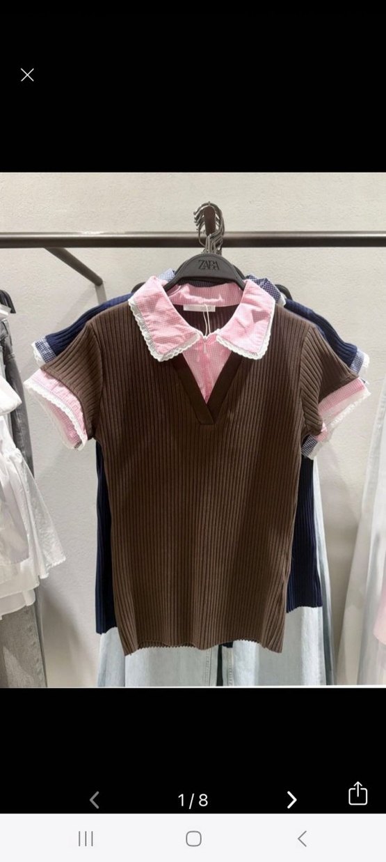 kahverengi triko polo tişört, pembe detaylı yakası ve kısa kollu. yeni etiketli s ve m bedeni mevcut
