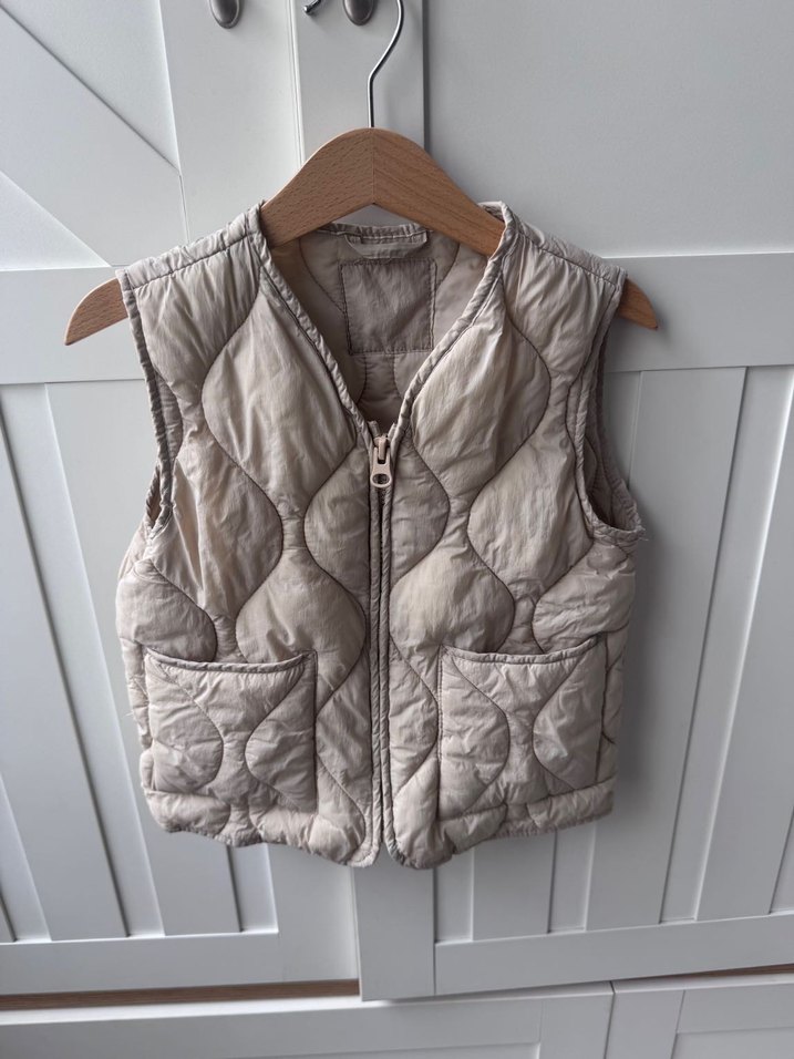 Bebekler için kolsuz, fermuarlı bej yelek. V yaka ve ince kesim, yumuşak kumaştan üretilmiştir. Sokak stili için uygun.