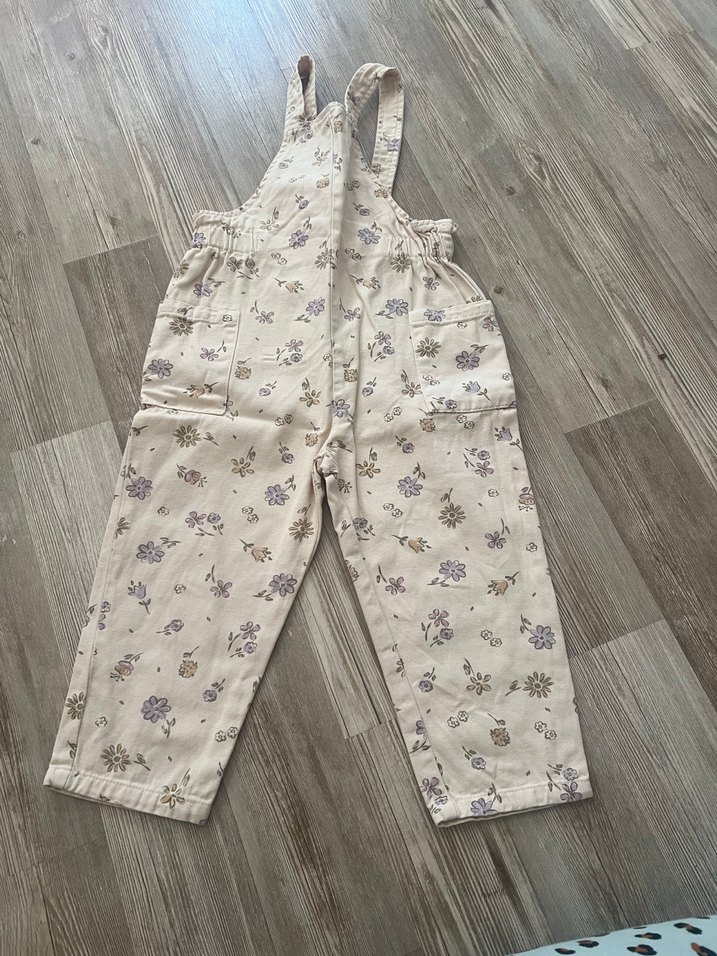 Bej renkli, pamuklu kumaştan yapılmış, gevşek kesimli kız salopet. Pastel çiçek desenleri, askılı ve düğmeli detaylara sahiptir.