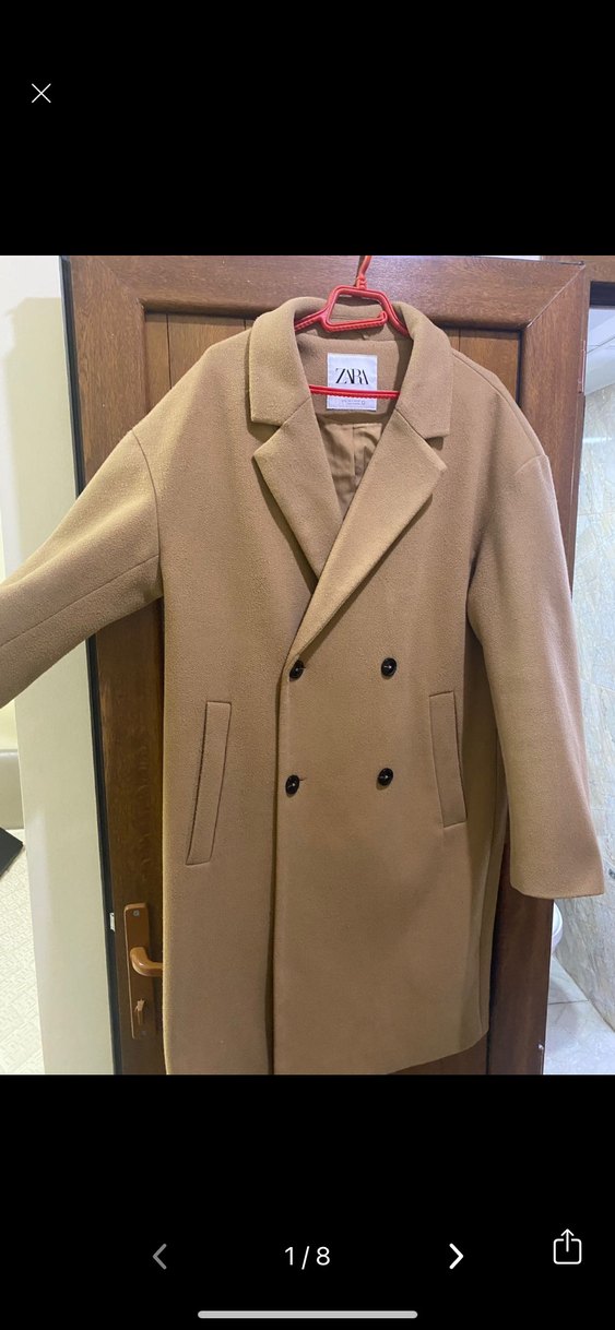 Zara markasına ait bej renkli, çift düğmeli klasik kesim kaban. Uzun kollu ve yan ceplidir.