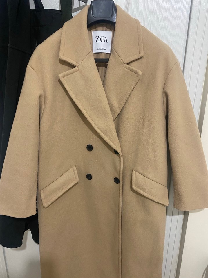 Zara marka, çift düğmeli, geniş yakalı ve iki cep detaylı yumuşak ve sıcak kumaştan kaban. Ürün S bedendir. Kalın sıcak tutmaktadır. Oversizedir. Koltuk altı kısmından alt uca kadar olan kısım 80 cm’dir. Göğüs genişliği 54 cm’dir. Çok az kullandım. Ürünün boyu 115 cm’dir. Boydan boya iç astarlıdır.