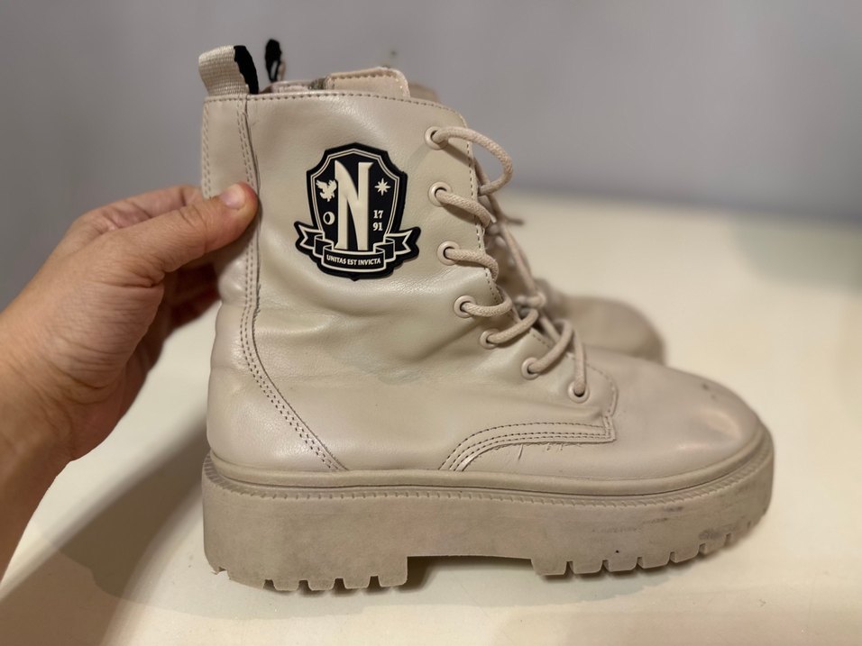 Bej suni deri, platform topuklu botlar, günlük rahat kullanıma uygun, baskılı amblemli ve zahmetsiz şıklık sunar. Fermuarlı. Wednesday koleksiyonu.