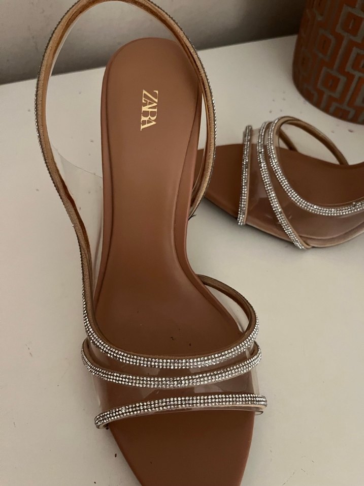 Bej deri stiletto topuklu Zara kadın ayakkabısı, parlak desenli ve tokalı şık detaylarla düğün gibi özel anlara uygun.