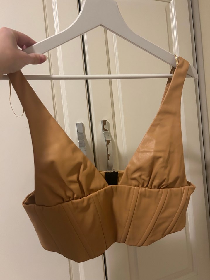 Bej deri, V yakalı ve askılı bu kemerli büstiyer, şık ve vücuda oturan bir siluet sunar. Parlak yüzeyiyle midi boyda, modern sokak modasına uygundur.