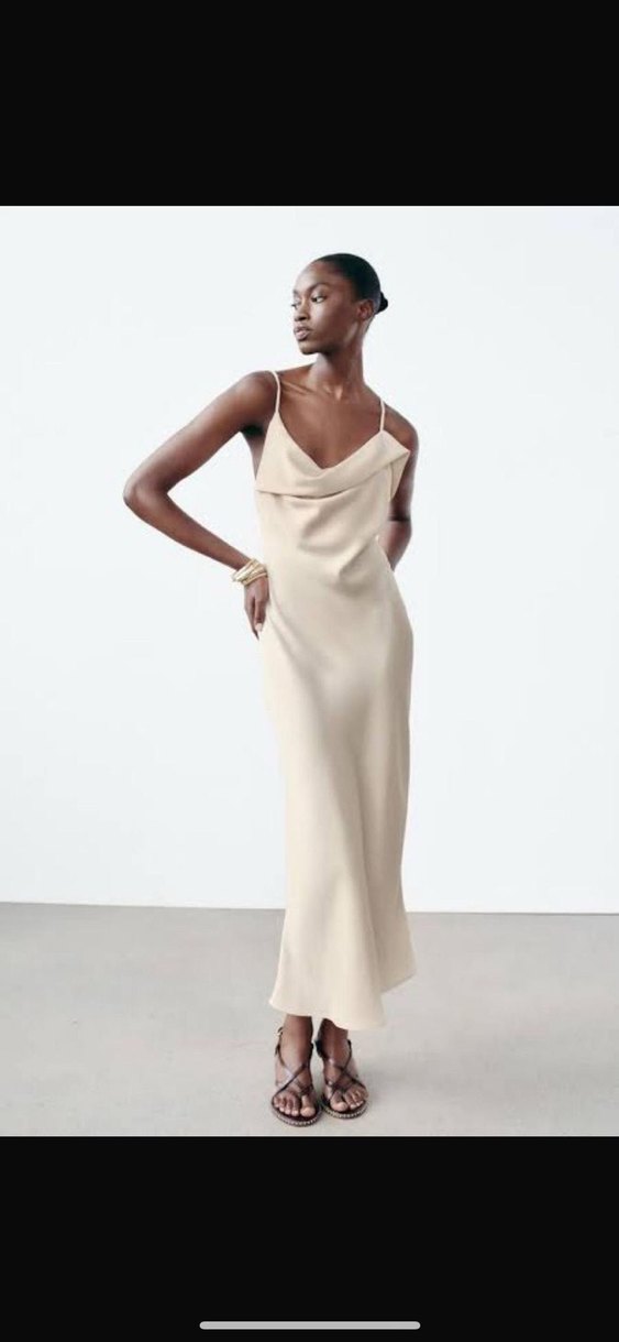Bej renkte, ipek görünümlü, drapeli uzun elbise. İnce askılı ve V yakalı, klasik ve minimal şıklık sunar. Düğünler için uygundur. Hiç giyilmedi 38-40 uyumlu