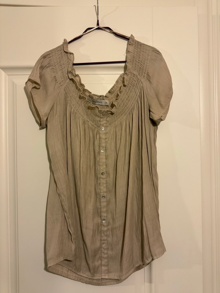 Zara marka, bej, düğmeli, kısa kollu, düşük omuz, salaş kesim bohem tarzda günlük bluz.