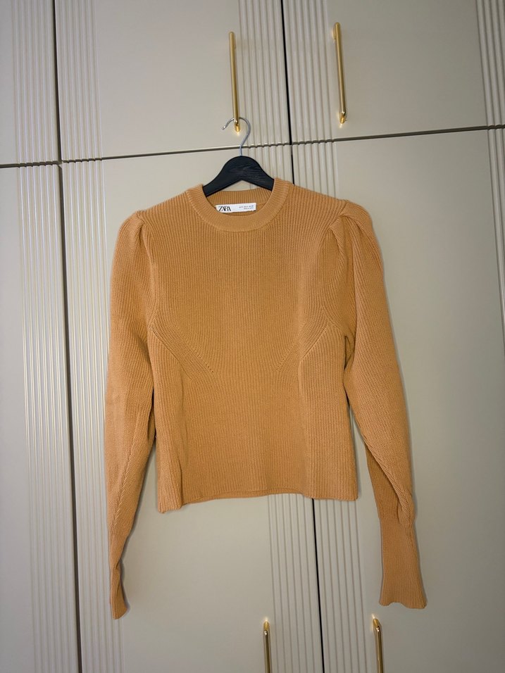 Zata bej renkli, fit kesim, yuvarlak yaka ve uzun kollu triko kazak, minimal ve trend sokak stili sunar.