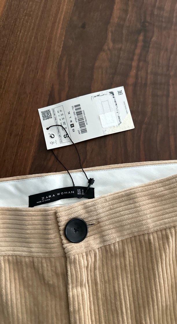 Bej renkli kadife pantolon, etiketi üzerinde kış ayları için ideal